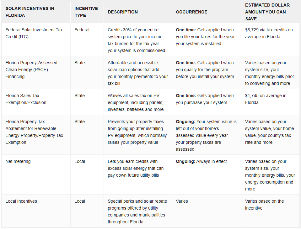 The federal solar investment tax credit (ITC) is the most substantial financial incentive available for PV systems in Florida. It’s offered by the federal government and is available to all Florida homeowners. The federal credit is for 30% of your entire system cost. In Florida, where residents pay an average of $29,095 for an average 11.5 kilowatt (kW) system, the credit amount comes out to around $8,729.